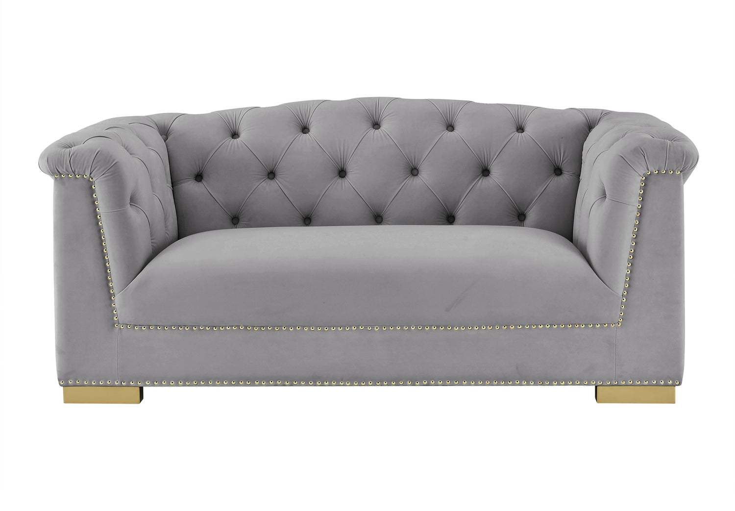 Offering a fresh and modern spin to a classic style, Inspire Me Home Decor and TOV proudly introduce the Farah loveseat. With its luscious velvet upholstery, unique tufted design on its rolled arms and hand applied gold nailhead trim, it will be the focal point of your living space. Available in several neutral color options to meet your home styling needs.