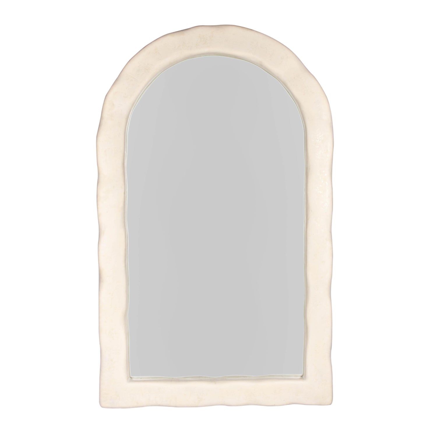 Embrace the wabi sabi trend with the Kaia Cream Textured Floor Mirror. Crafted with organic bumpy texture and a beautiful sculptural arch, this mirror brings a touch of natural beauty and artistic appeal to your space. Standing impressively at 79"H, this floor mirror becomes a captivating centerpiece. Expertly made with fiberglass, it combines durability with stunning design, making it a functional and stylish addition to your home.
