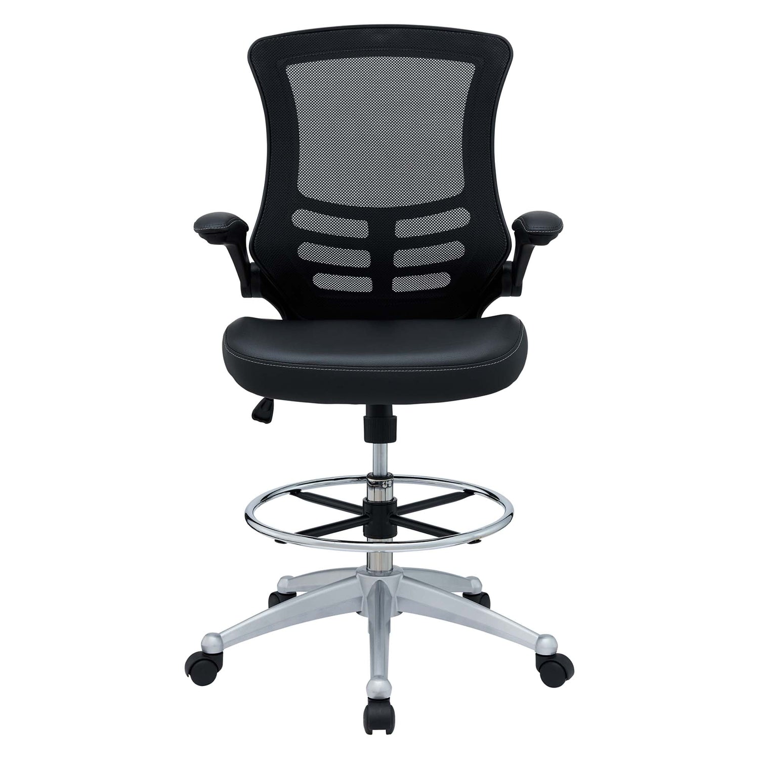 Chart new territory while seated from the comfort of the Attainment Drafting Stool. Attainment features a breathable mesh back for lower back lumbar support, padded waterfall vinyl seat to ease pain and pressure around your thighs, flip-up padded arms, foot ring with an extra tall gas cylinder, and securely locks in place with a user-friendly seat tilt plus tension control knob. Attainment is a progressive-minded drafting stool perfect for school, work, or home use.