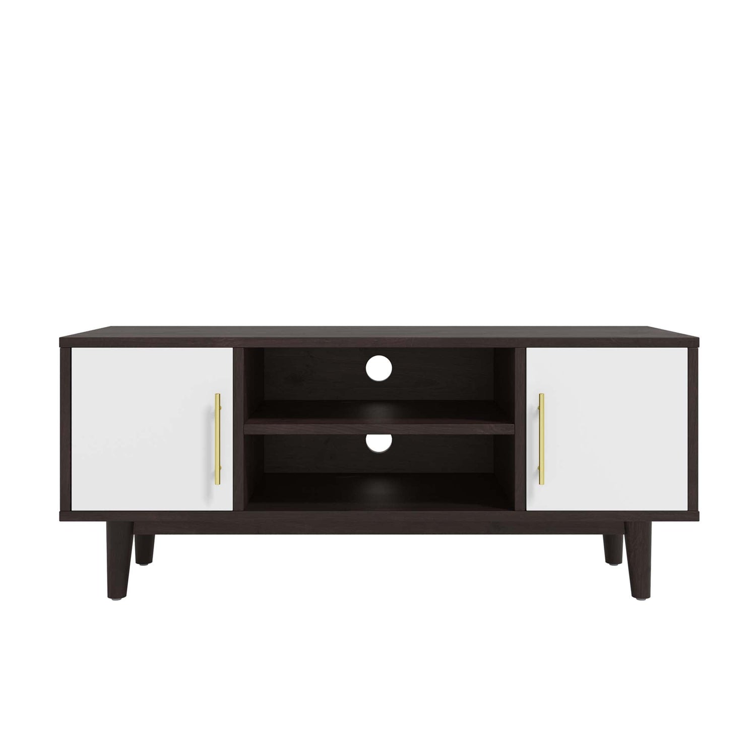 Encourage mid-century modern design in your living space with the Daxton 43" TV Stand. Sleek lines, splayed legs, gold metal hardware, and contrasting tones create a striking piece for your living room, bedroom, lounge room, or home office. Made with particleboard, MDF, and beautiful wood grain paper lamination, Daxton features ample storage space with an adjustable center shelf and two storage areas behind solid white doors. Cable management holes make this entertainment console ideal for keeping all your media essentials organized. A versatile addition, this television stand can accommodate TV's up to 46" and also serves as a display stand for home accessories, decor, and more. Includes non-marking foot pads.