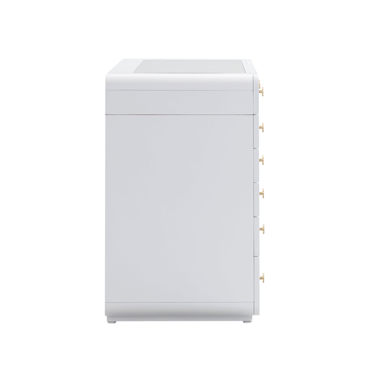 Introducing the Hollywood White Vanity Desk: Your ultimate #GRWM station! Decked out with metal hardware and a top drawer lined for all your treasures, it's perfectly paired with the dazzling Lola LED panel vanity mirror for that extra sprinkle of Hollywood glam. This beauty boasts a spacious tabletop mirror to catch that good light, making your makeup pop and those selfies fire while ensuring cleanup is a breeze. With tons of drawers, including some shallow ones, it's all about keeping your products organized and easily accessible. For added versatility, the mirror can easily be disassembled or hung on the wall.