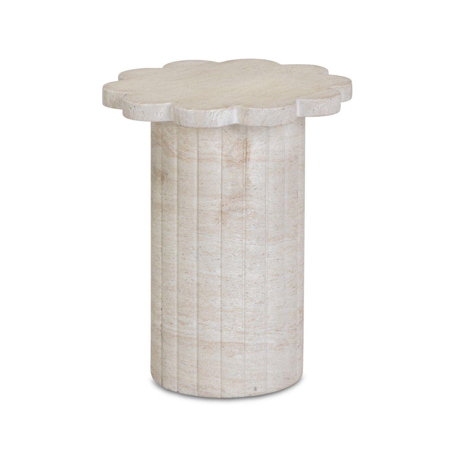 Inspired by the delicate beauty of blooming petals, the Blossom Washed Travertine Finish Indoor/Outdoor Side Table brings a touch of romance to any space. Its graceful flower petal silhouette, adorned with vertical channeling and a washed travertine finish, captures the charm of nature's artistry. Crafted from durable concrete, this versatile piece is designed to flourish both indoors and outdoors, creating the perfect centerpiece for moments of connection, laughter, and quiet reflection.