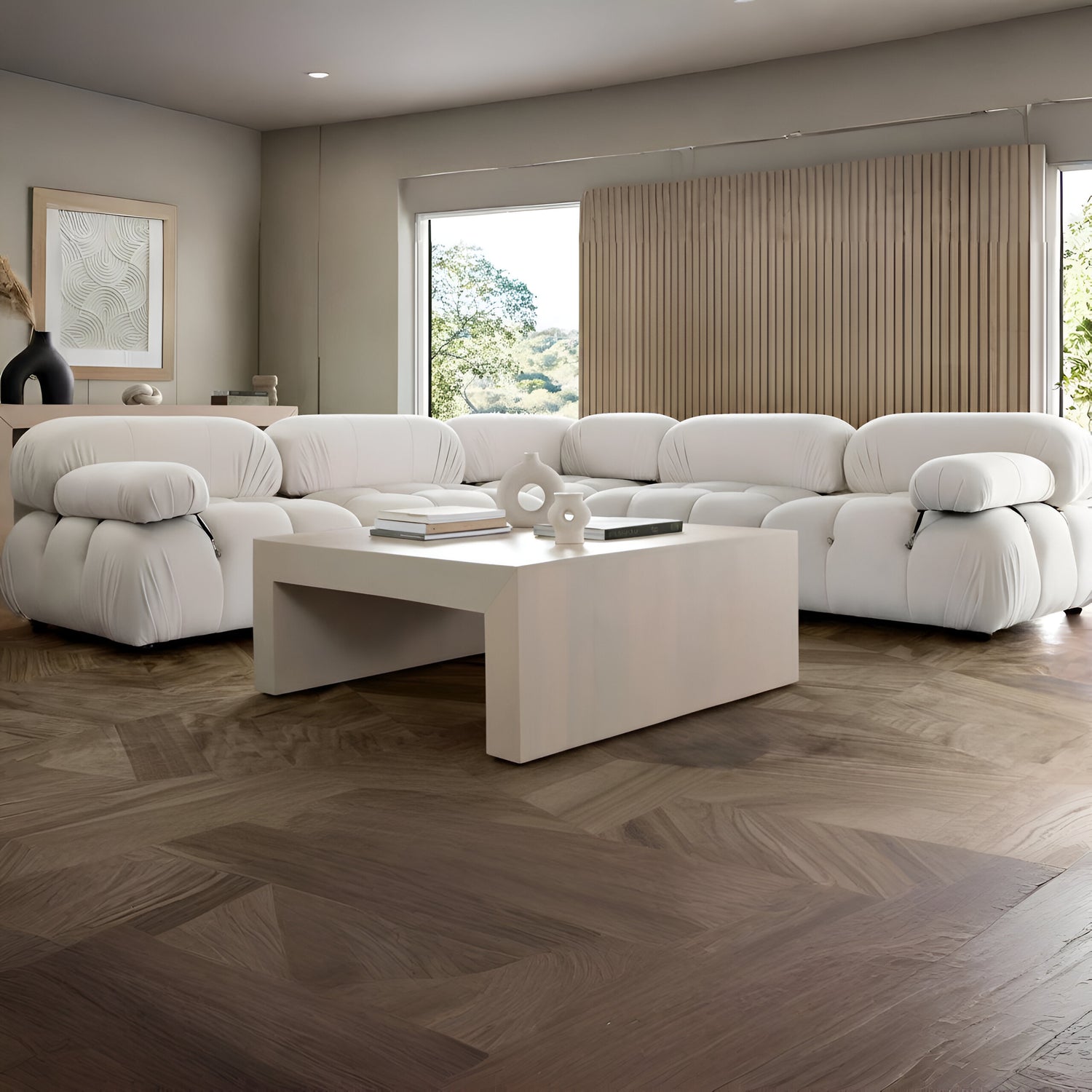 Introducing the Paloma Modular Collection, a true blend of form, function, and style. With its bubble grid tufted design, carabiner attachment system for arms and cushions, and plush velvet pleated covering, this collection brings chic sophistication and modern comfort to any space. Available in Light Cream and Mink Tan Velvet, the Paloma Modular Collection allows for flexible configurations to perfectly fit your home.