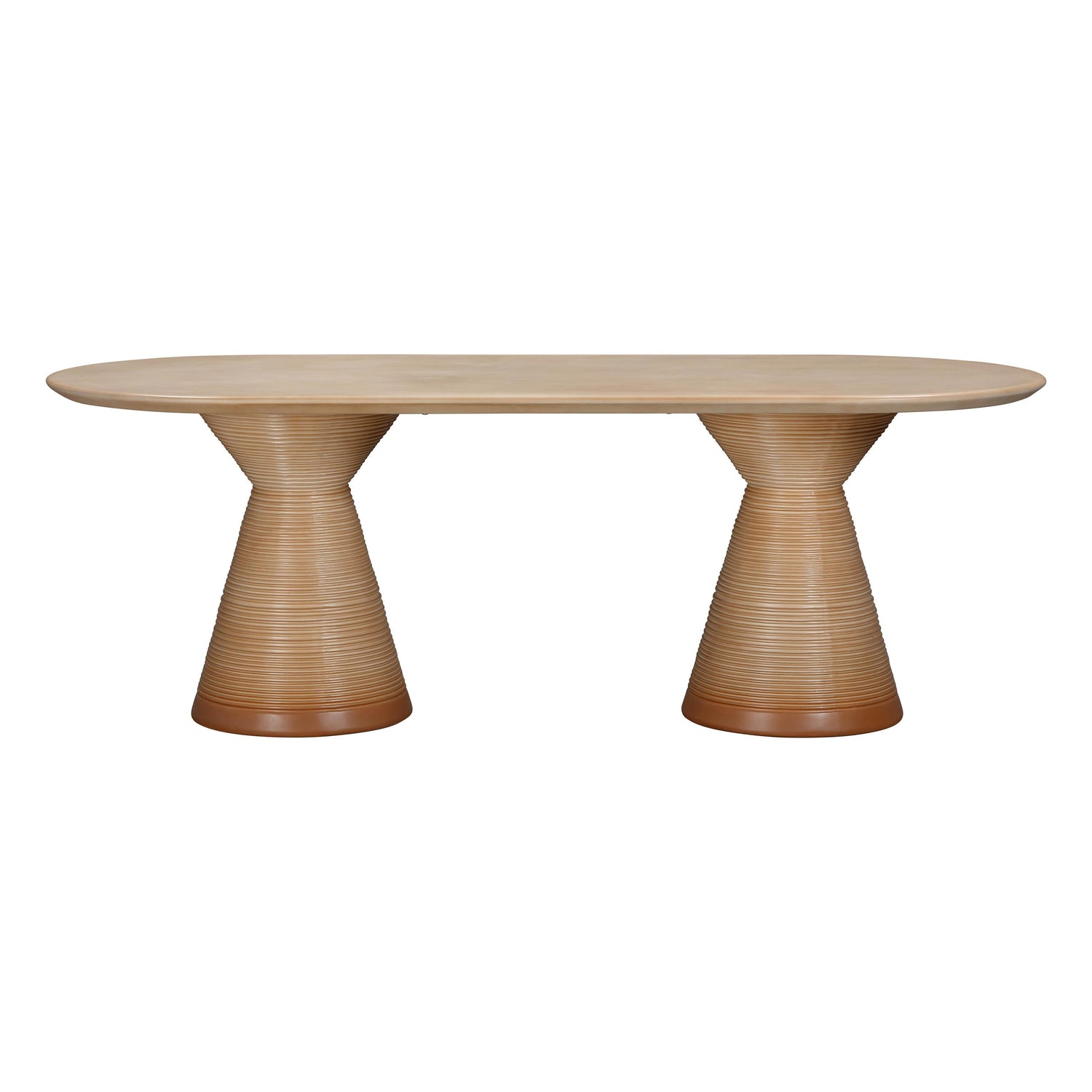 Introducing our Fassa Terracotta Oval Indoor/Outdoor Dining Table- A midcentury marvel seamlessly blending cool vibes with functional design. The rounded and tapered edge adds a hint of retro charm, while the textured faux terracotta top boasts natural shading. Fassa's oval shape and pedestal bases not only enhance its sleek silhouette but also invite friends and family to gather around in style.