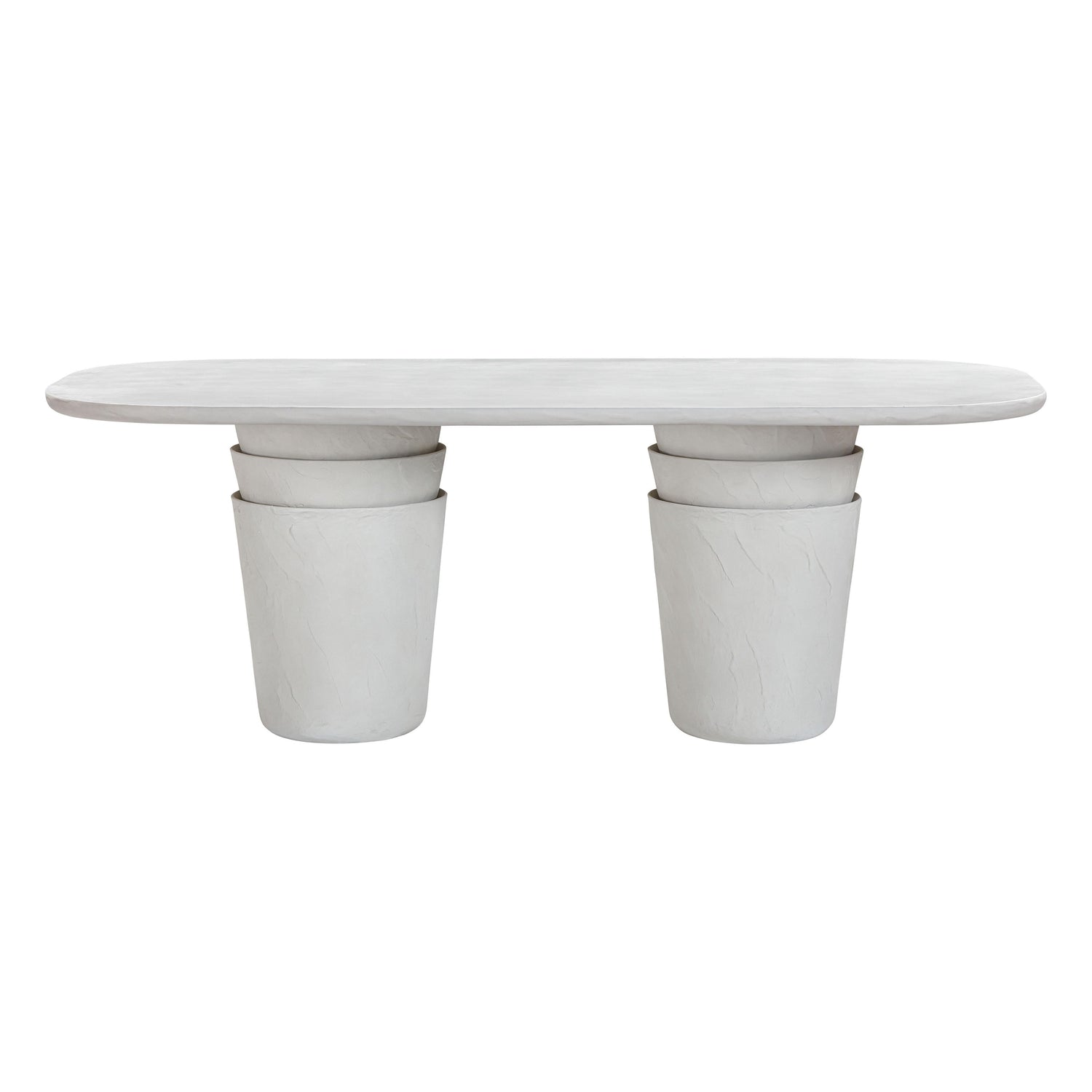 Introducing the Margot Light Grey Faux Plaster Indoor/Outdoor Concrete Dining Table, a versatile and stylish addition to your living space. Crafted with a faux plaster finish, this table seamlessly transitions between indoor and outdoor settings, offering the perfect blend of functionality and aesthetics. The rounded edges of the table create a sense of fluidity, beautifully contrasting against the rugged materiality of its sturdy fiberglass-reinforced concrete construction, while the coordinating stool mirrors the distinctive shape of the table pedestals, ensuring a cohesive look for your dining area.