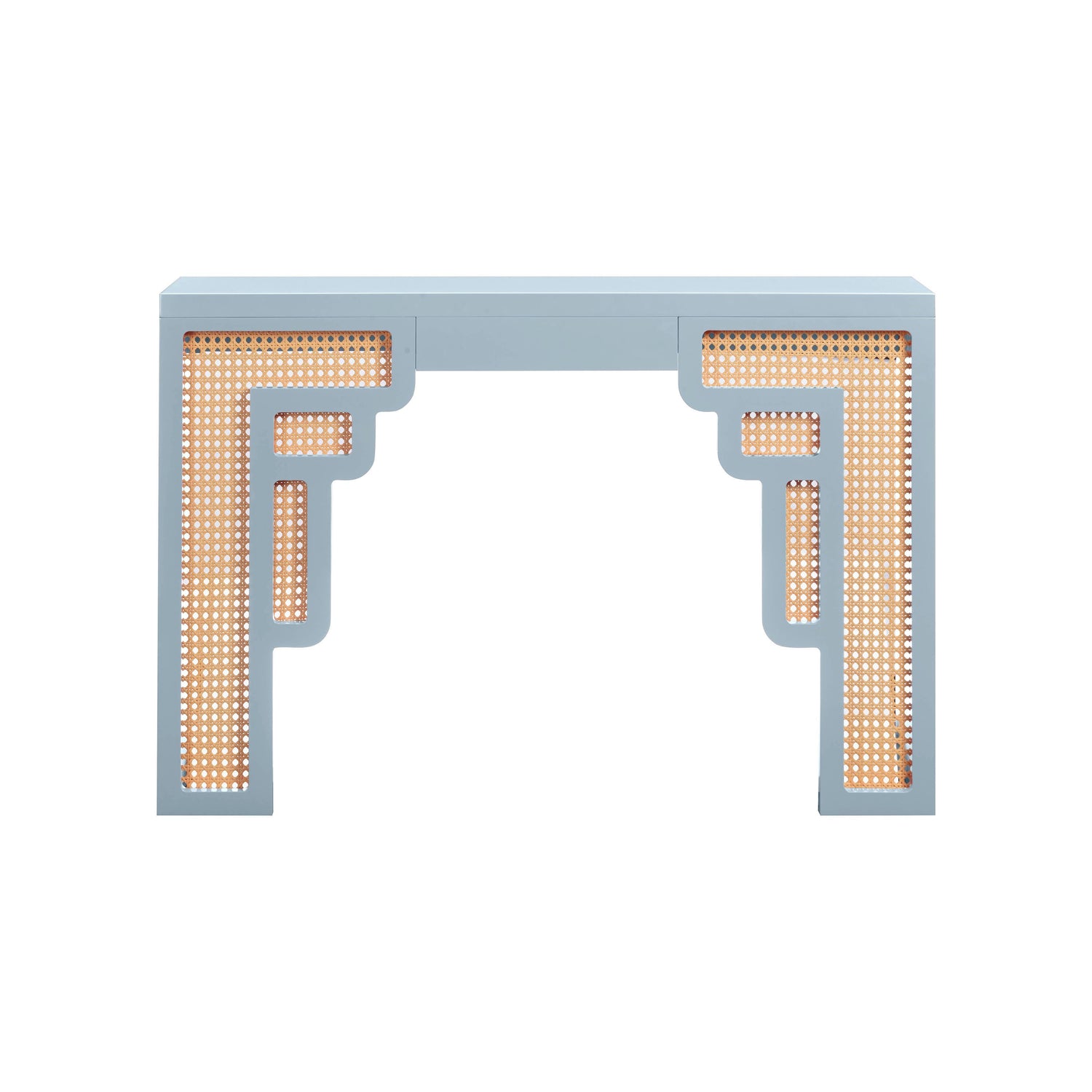 Inspired by the Art Moderne style, the Suzie console table alludes to Palm Springs' art-deco design through its bold colors and curvaceous form. This wooden console table is available in several exciting colors and its rounded edges and woven rattan details add a playful twist. The Suzie will cement itself as the perfect balance between contemporary living with a touch of glamour in your space!