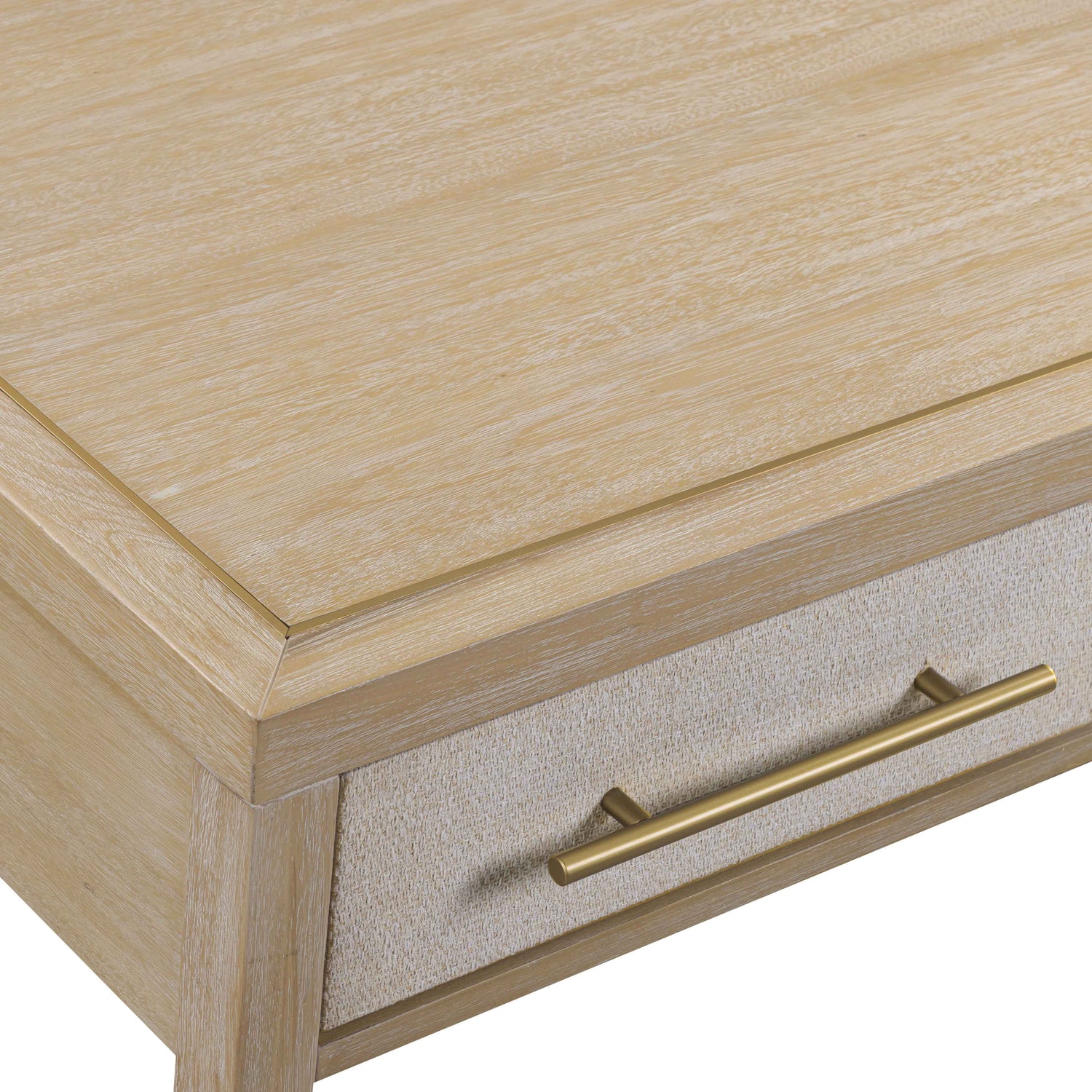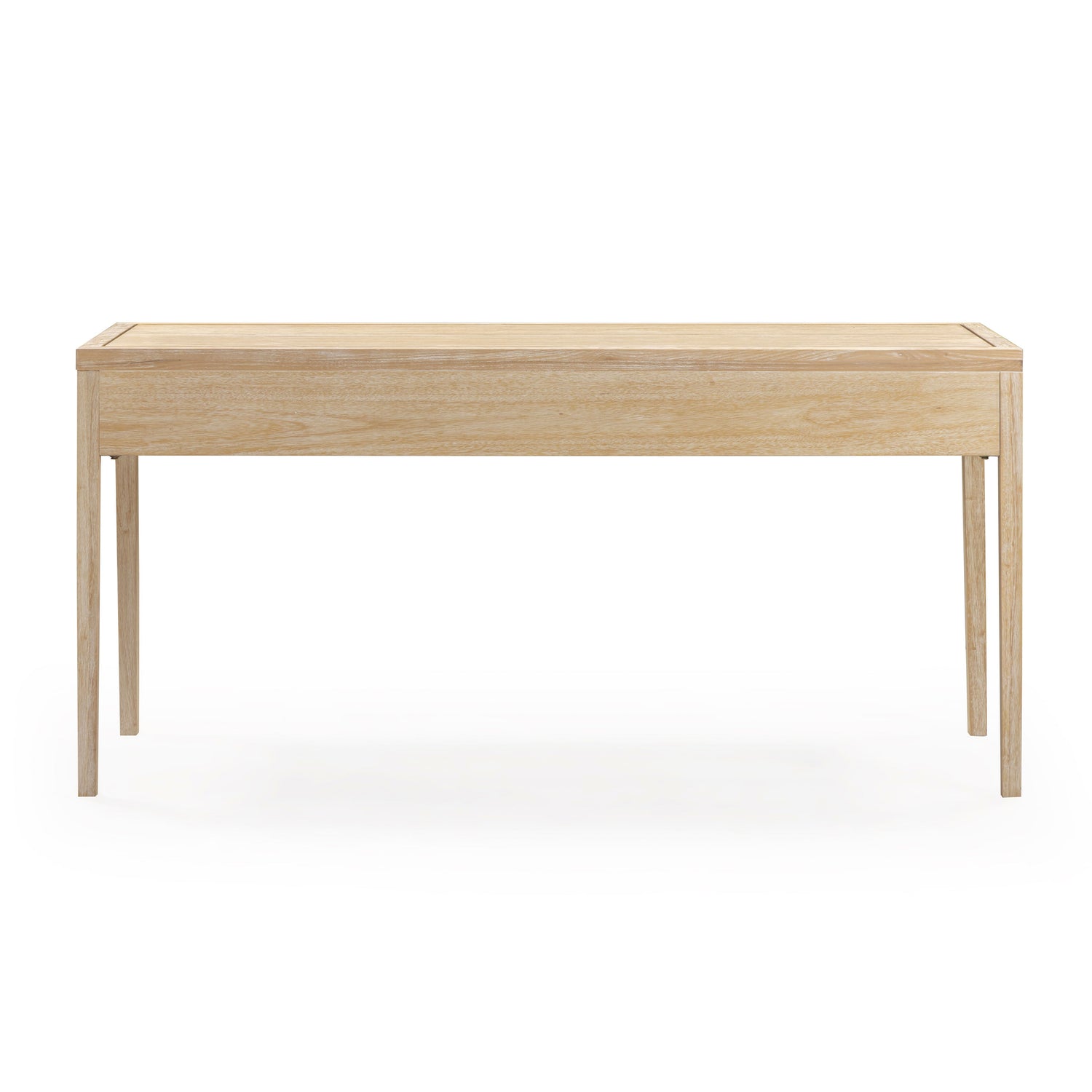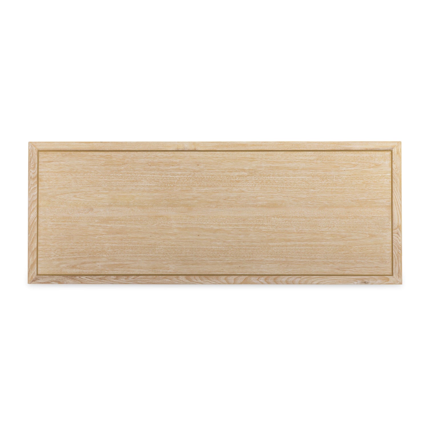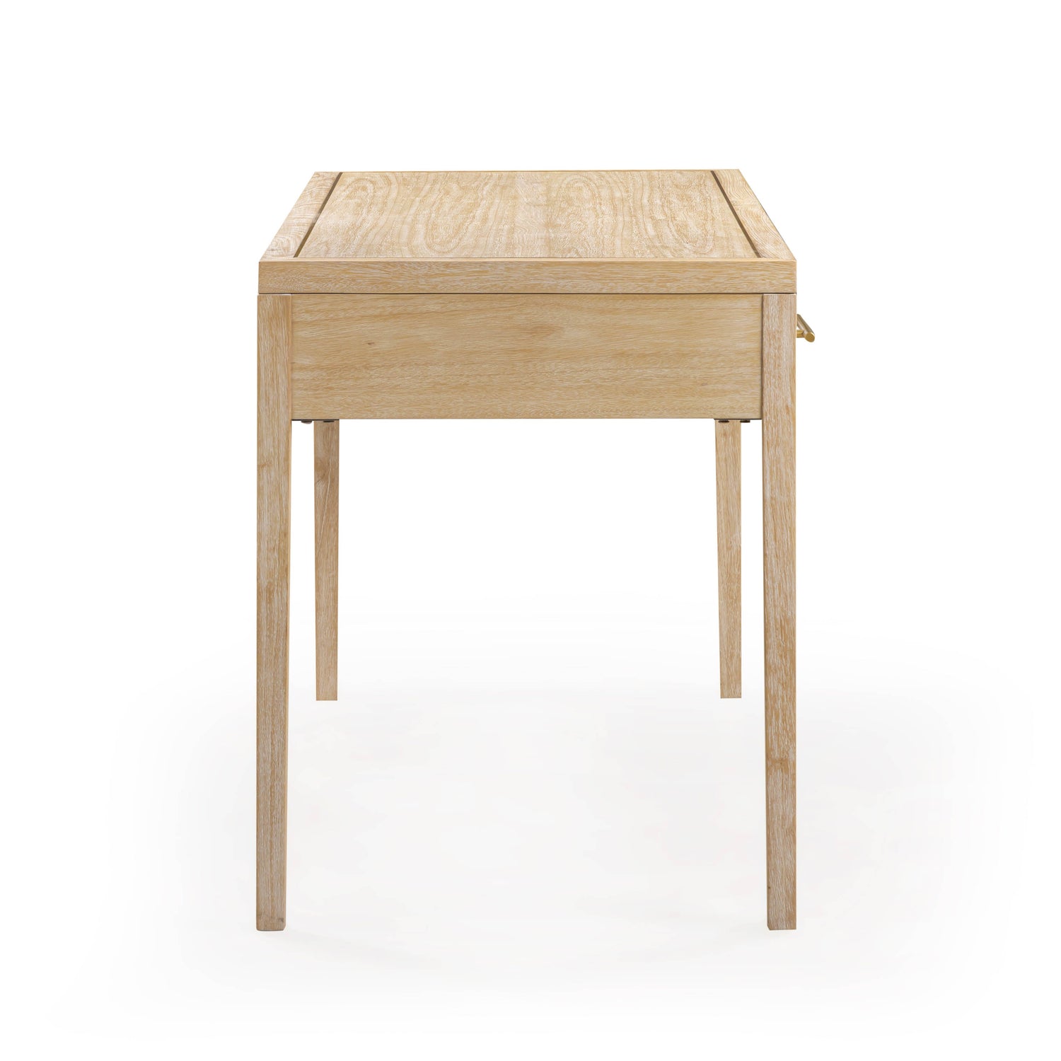 Bring effortless sophistication to your workspace with the Hera Natural Washed Executive Desk. Crafted from Rubberwood with a cerused brushed veneer, it features two soft-close drawers with fabric-textured fronts and solid metal hardware for a refined, high-end look. With a finished back and generous 62" surface, Hera is as stunning in the center of a room as it is against a wall.