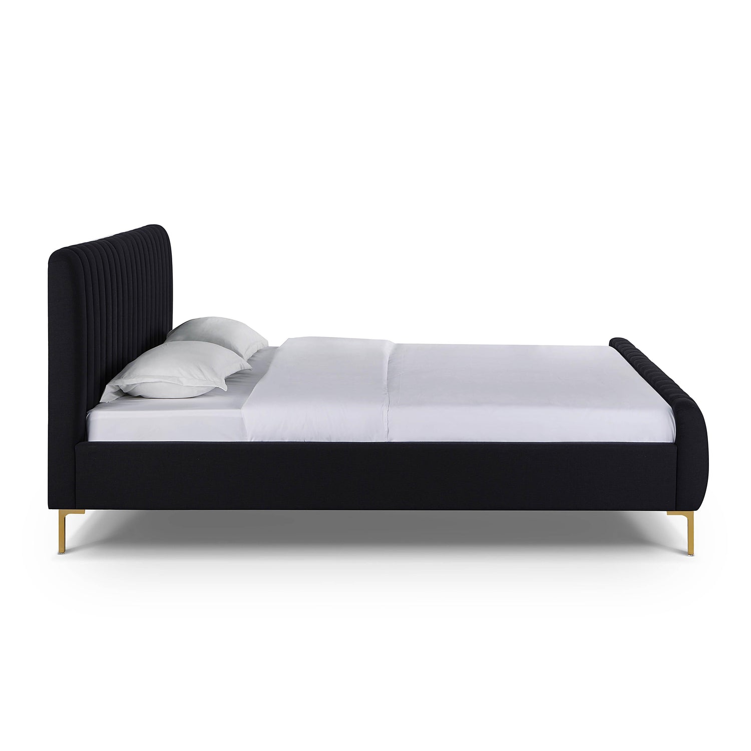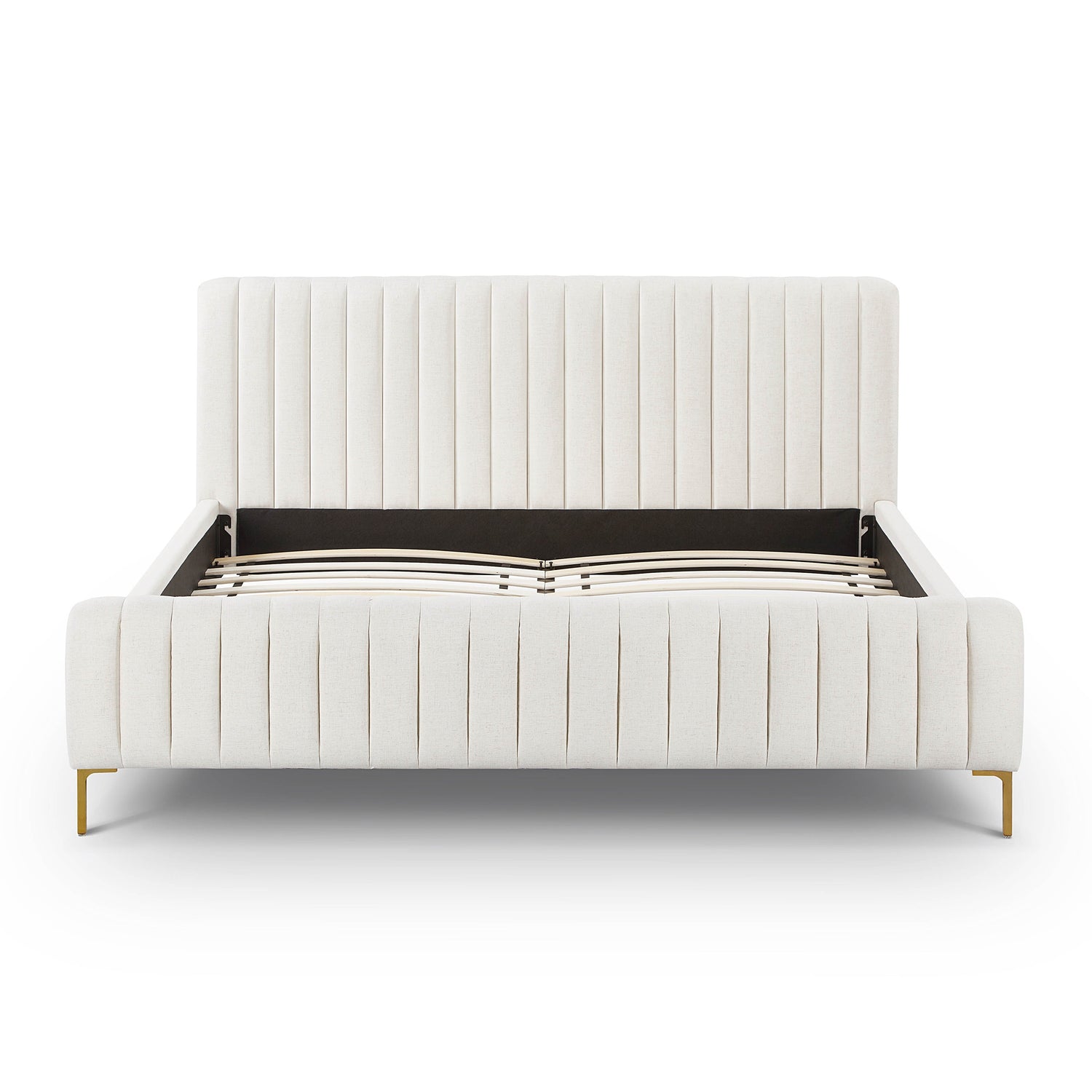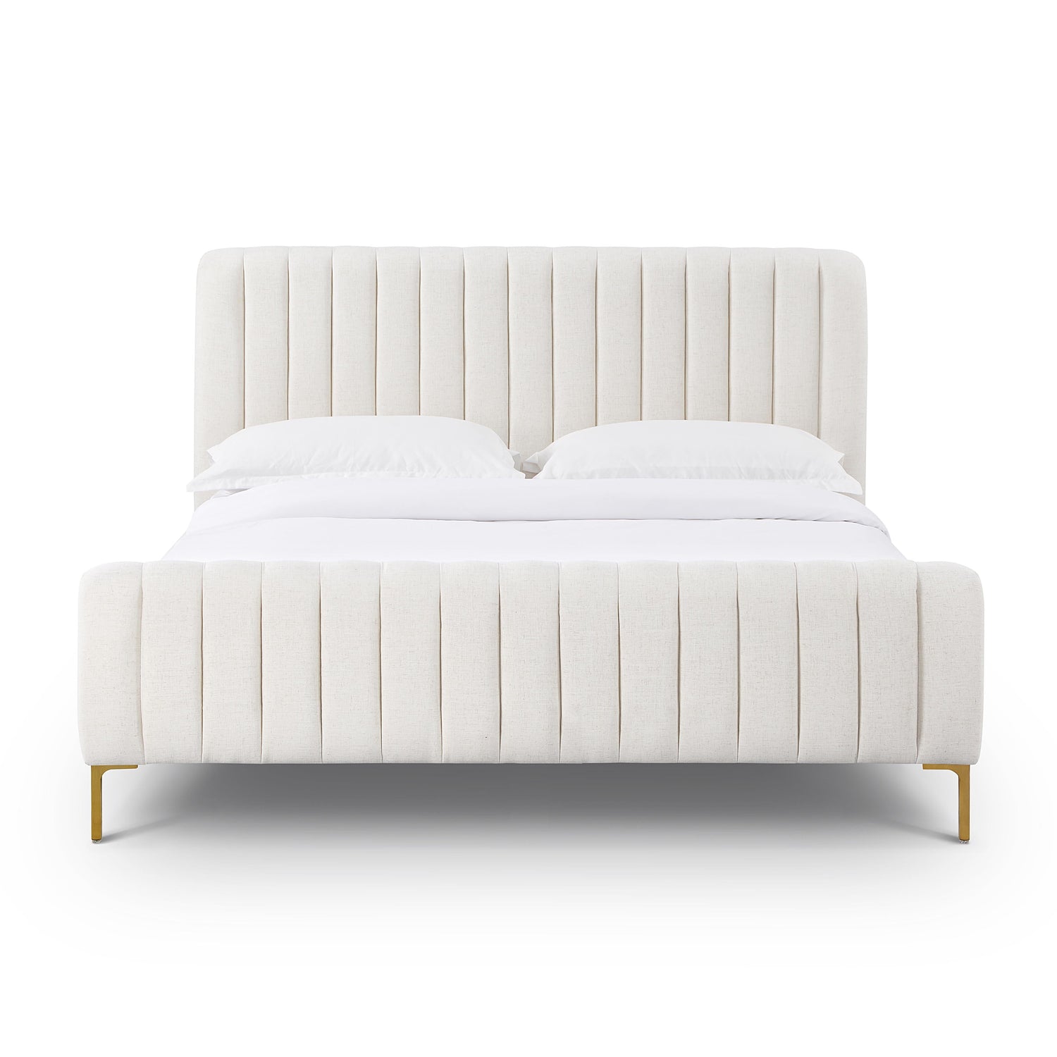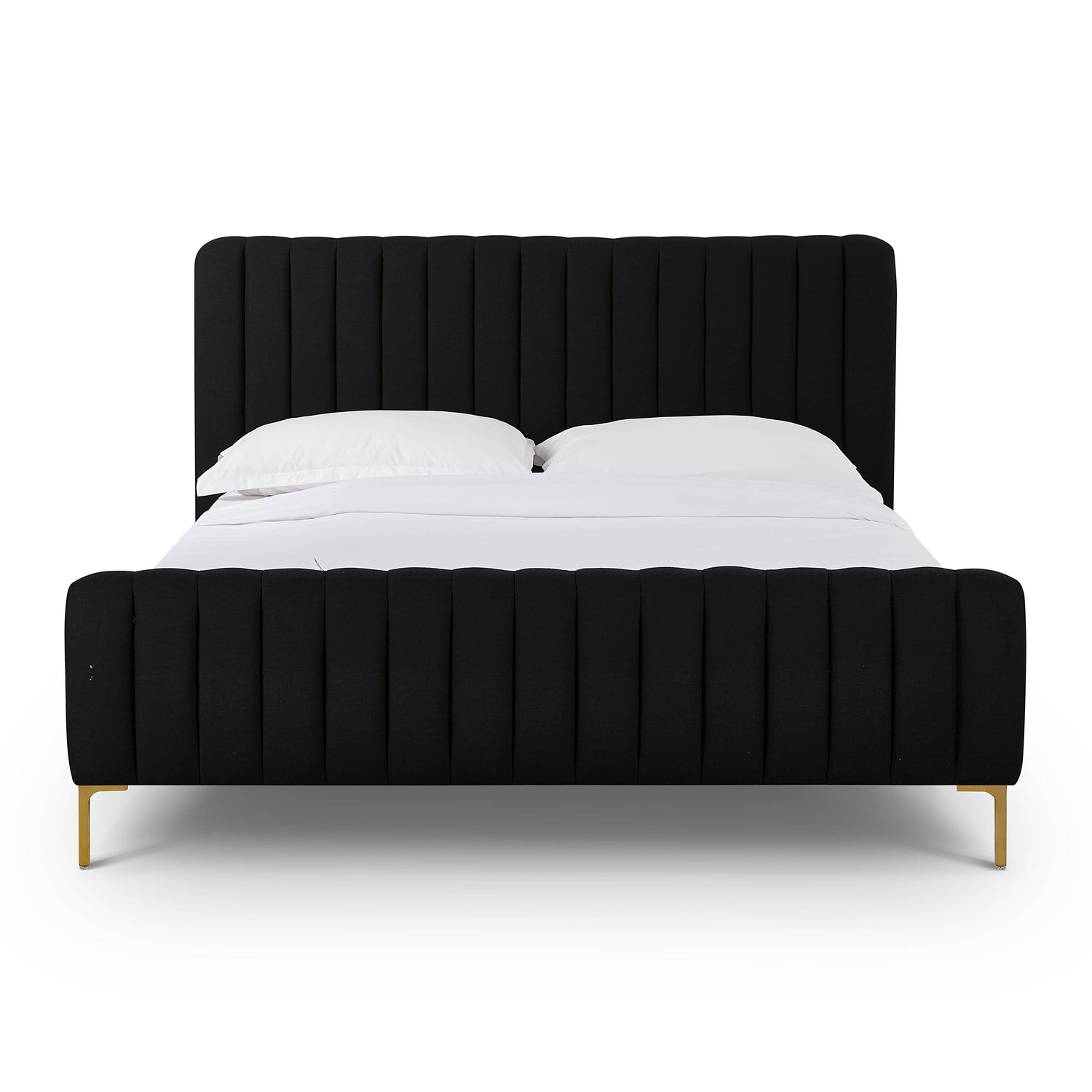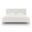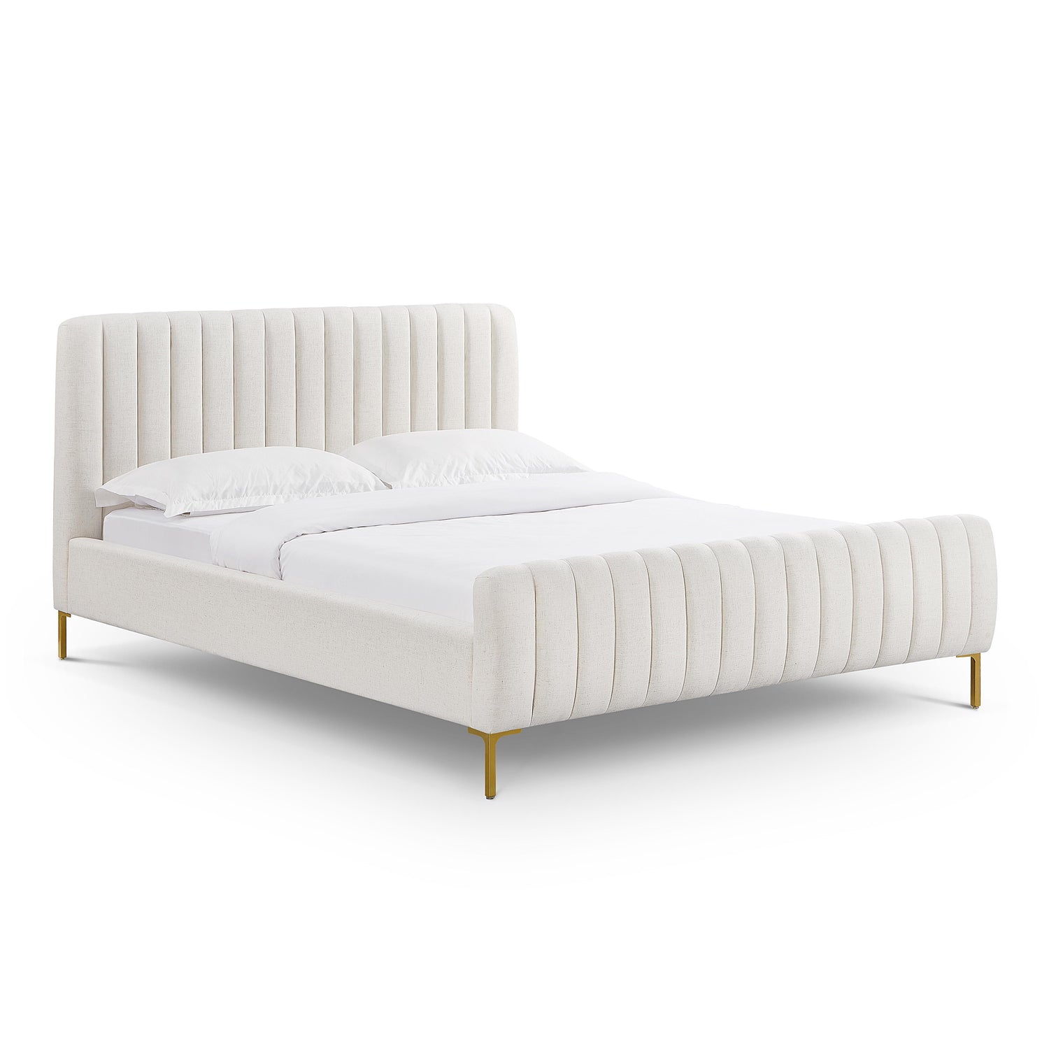 We can't guarantee your dreams will come true, but at least we can help you dream in style. The Angela bed features glam design, channel tufting and gold legs that pop against the sumptuous upholstery. Available in queen or king and multiple color and fabric options.